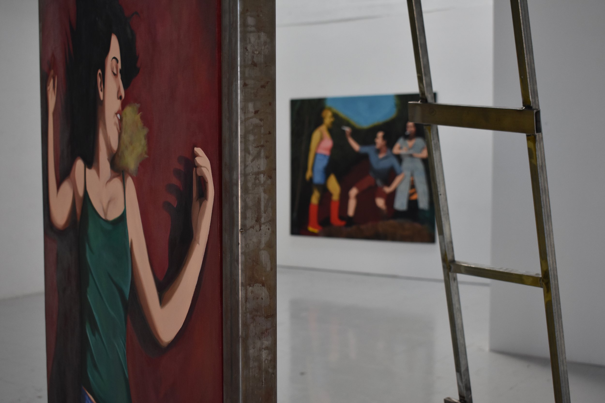 The outcome was an installation composed of an aluminum stool, a steel structure with ladder, a wooden panel, and an oil painting on canvas, creating a dialogue between painted surface and constructed space.