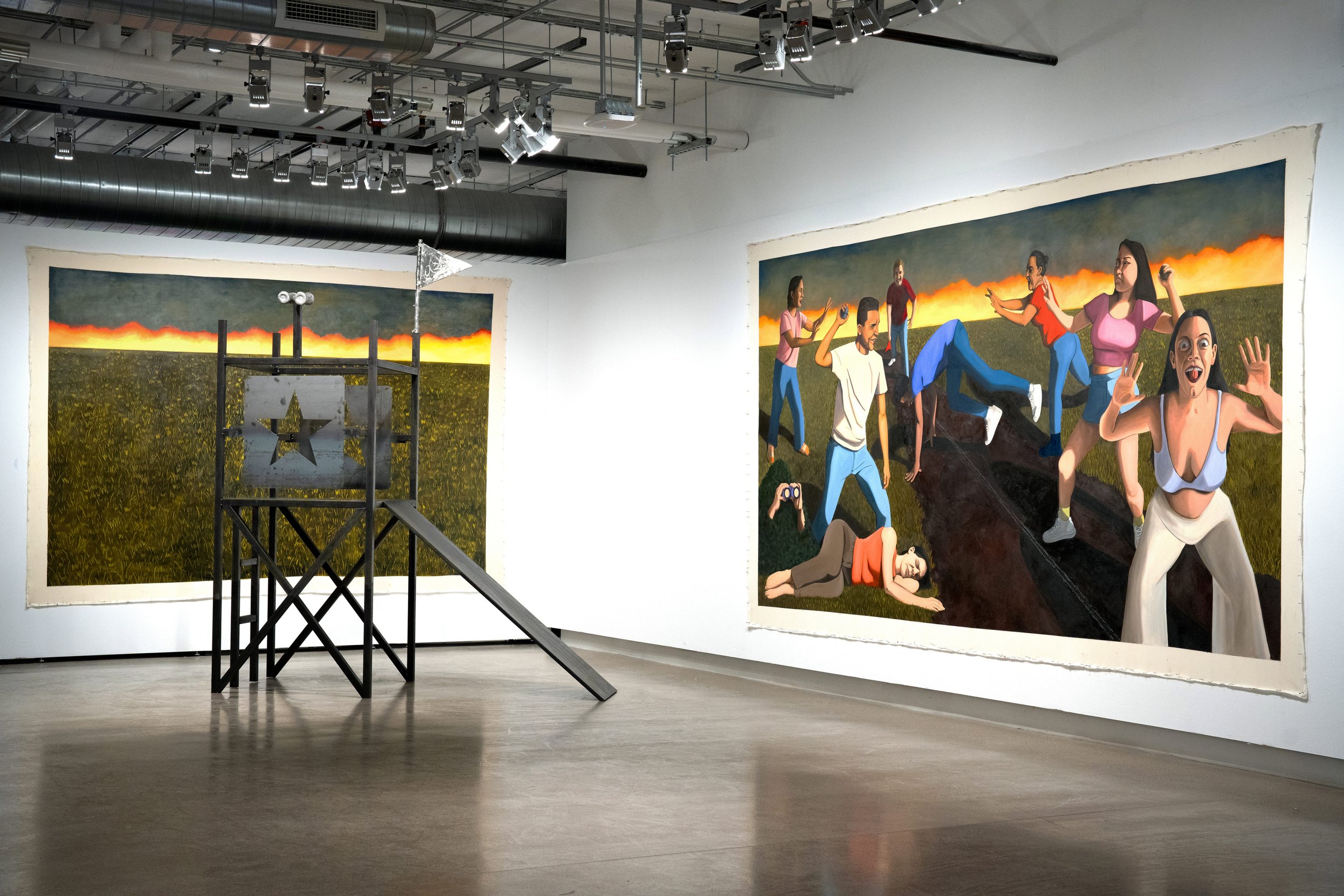 The Border is a Line that Birds Cannot See is an exhibition that explores the tension between barriers and passageways through painting and sculptural installation. At its center is a metallic structure made of cast aluminum and steel, which shifts between the form of a military observation post and a playground slide. This duality reflects the contradictory nature of borders—restrictive yet permeable, spaces of both surveillance and play.